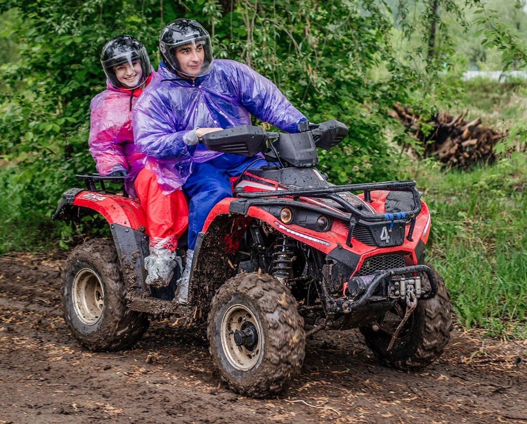 Двое могут ехать на одном квадроцикле , если общий вес не более 130кг с доплатой за пассажира 1000 руб.